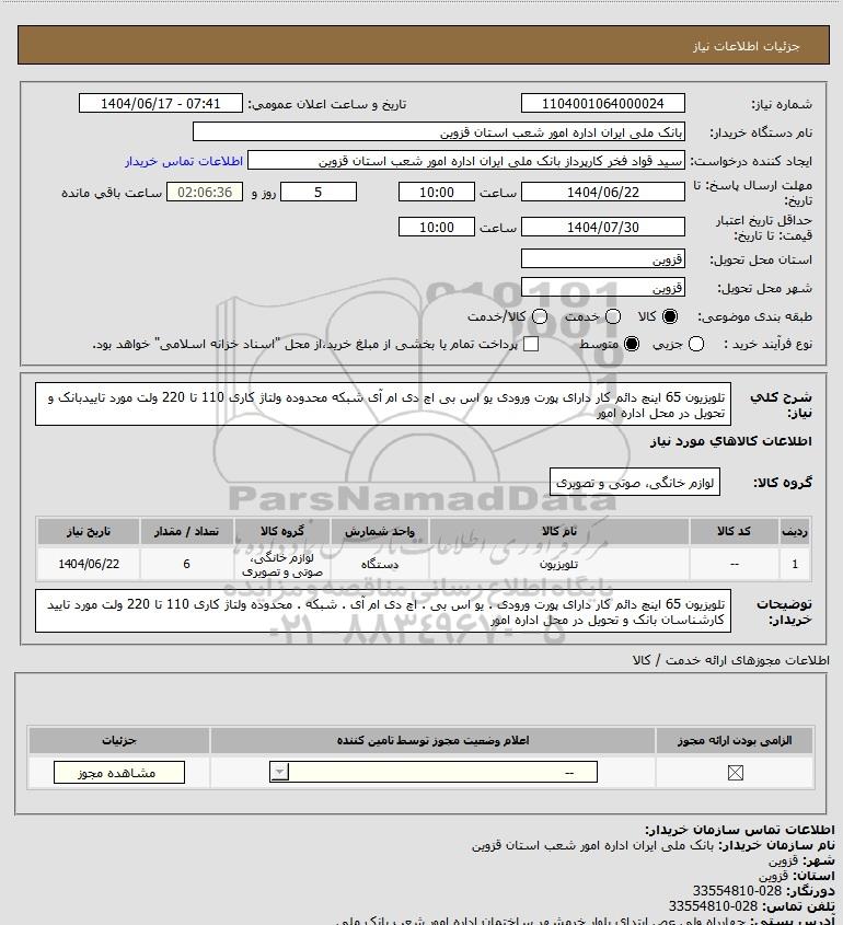 شرح کلی نیاز: تلویزیون 65 اینچ دائم کار دارای پورت ورودی یو اس بی اچ دی ام آی شبکه محدوده ولتاژ کاری 110 تا 220 ولت مورد تاییدبانک و تحویل در محل اداره امور