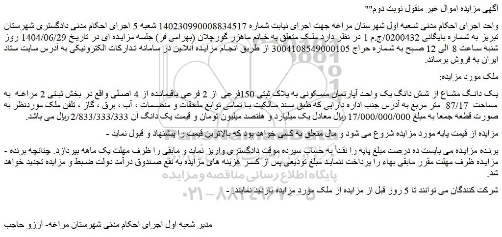 واحد اجرای احکام مدنی شعبه اول شهرستان مراغه جهت اجرای نیابت شماره 140230990008834517 شعبه 5 اجرای احکام مدنی دادگستری شهرستان تبریز به شماره بایگانی 0200432/ج.م 1 در نظر دارد ملک متعلق به خانم ماهزر گورچلان (بهرامی فر) جلسه مزایده ای در تاریخ 1404/06/29 روز شنبه ساعت 8 الی 12 صبح به شماره حراج 3004108549000105 از طریق انجام مزایده آنلاین در سامانه تدارکات الکترونیکی به آدرس سایت ستاد ایران به فروش برساند.
