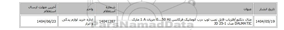 1404/05/19 متال دتکتور/آشکارساز فلز  ‎قابل نصب‏ ‎لوپ درب اتوماتیک‏ فرکانس ‎0...50 Hz‏ جریان ‎1 A‏ مارک DALMATIC‎ مدل ‎JD 25-1 14041287 اداره خرید لوازم یدکی و ابزار 1404/06/23