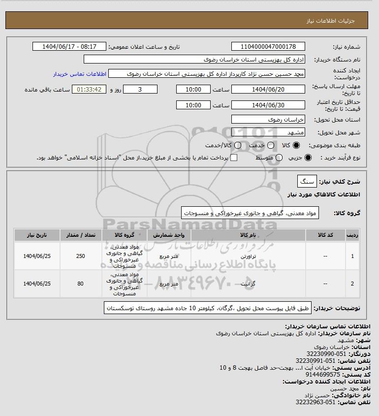 | 2 | -- | گرانیت | متر مربع | مواد معدنی، گیاهی و جانوری غیرخوراکی و منسوجات | 80 | 1404/06/25 |