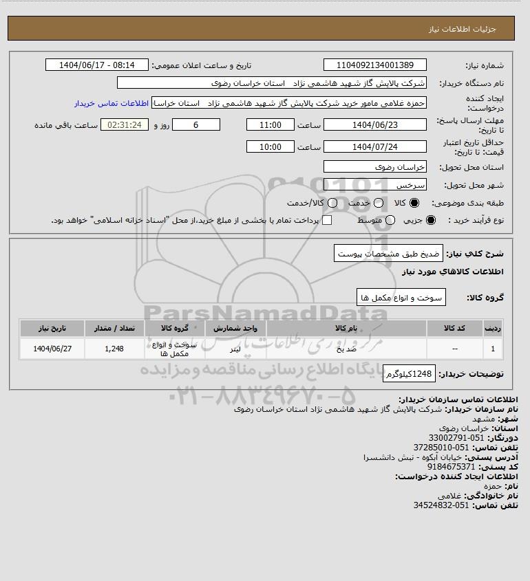 شرح کلی نیاز: ضدیخ طبق مشخصات پیوست
