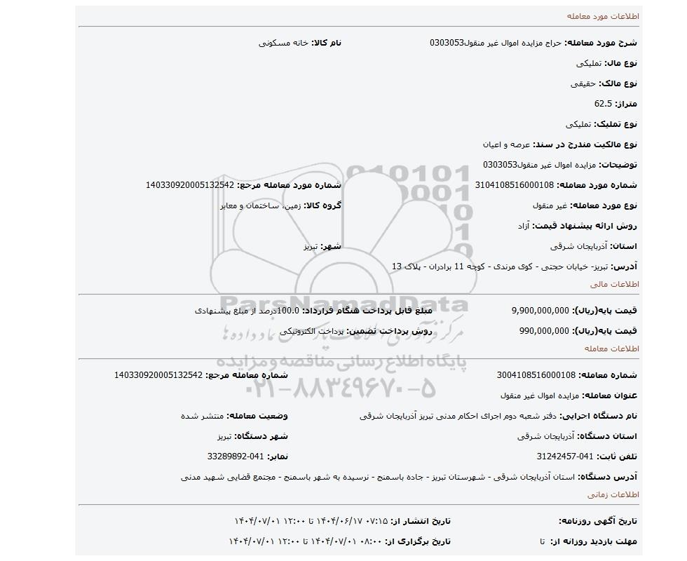 مزایده مزایده اموال غیر منقول0303053, مزایده، مزایده اموال غیر منقول0303053