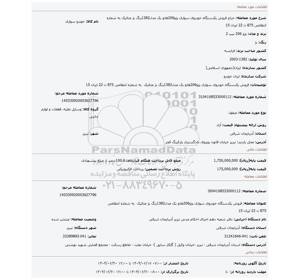 عنوان معامله: فروش یکدستگاه خودروی سواری پژو206هاچ بک مدل1382رنگ بژ متالیک  به شماره انتظامی 875 ن 22 ایران 15