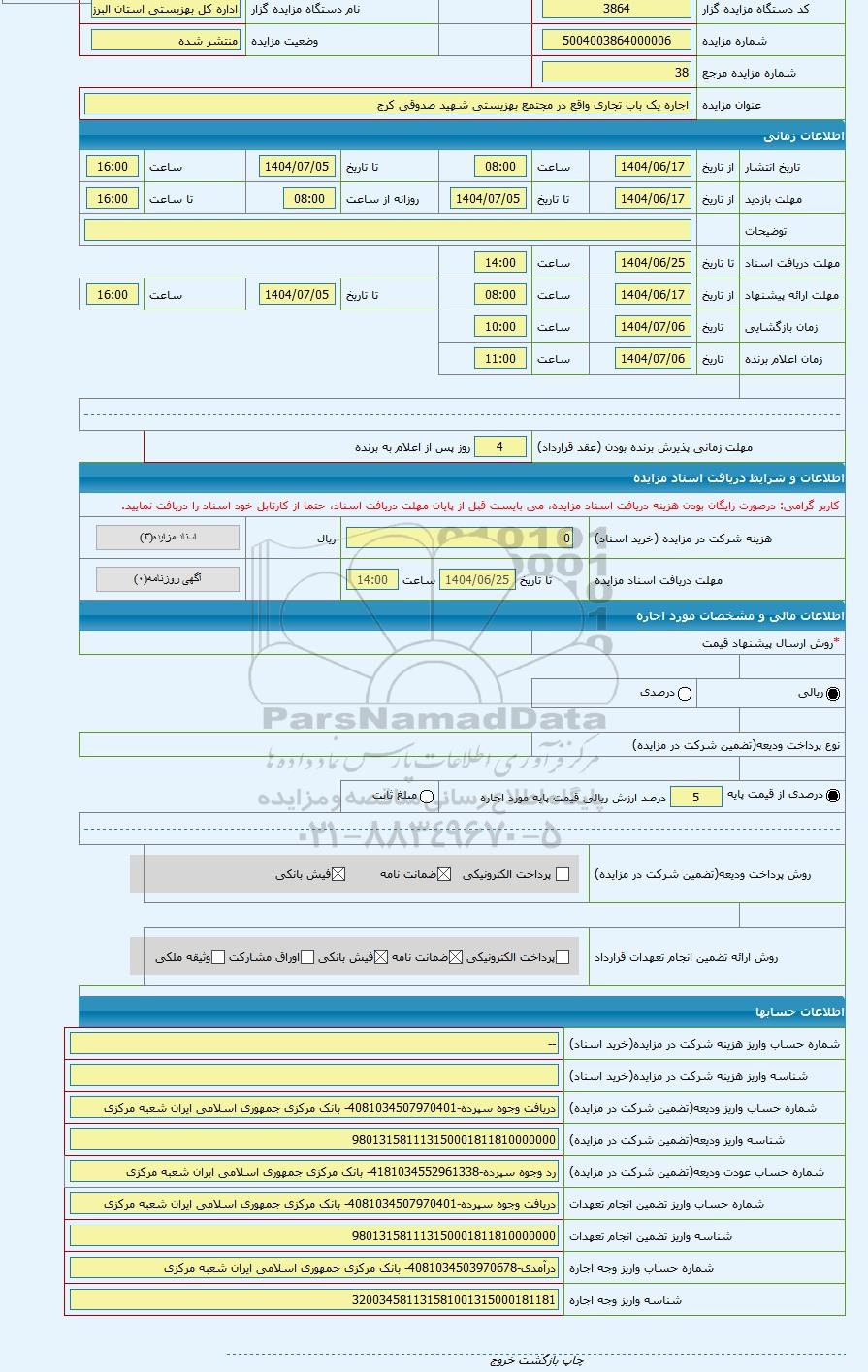 شماره مورد اجاره5104003864000006نوع برگزاری مزایده مزایده عمومی