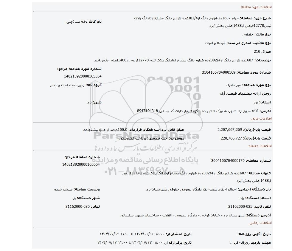 | عنوان معامله: 1607ده هزارم دانگ از2302/4ده هزارم دانگ مشاع از6دانگ پلاک ثبتی12778فرعی از1488اصلی بخش4یزد | ||