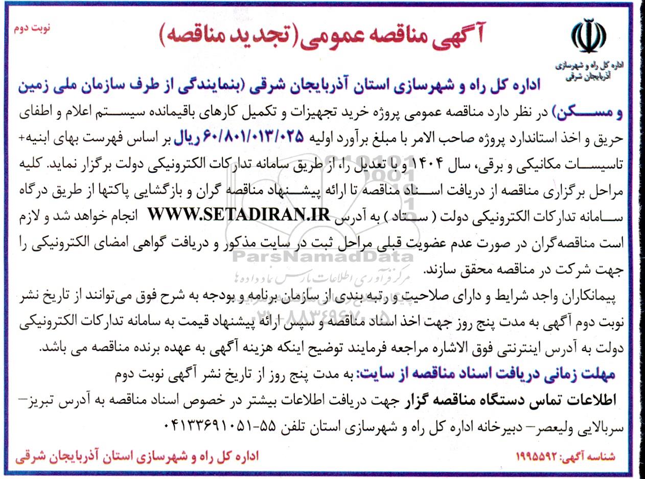 اداره کل راه و شهرسازی استان آذربایجان شرقی (بنمایندگی از طرف سازمان ملی زمین و مسکن) در نظر دارد مناقصه عمومی پروژه خرید تجهیزات و تکمیل کارهای باقیمانده سیستم اعلام و اطفای حریق و اخذ استاندارد پروژه صاحب الامر با مبلغ برآورد اولیه 60.801.013.025 ریال بر اساس فهرست بهای ابنیه + تاسیسات مکانیکی و برقی، سال 1404 و با تعدیل را، از طریق سامانه تدارکات الکترونیکی دولت برگزار نماید. کلیه مراحل برگزاری مناقصه از دریافت اسناد مناقصه تا ارائه پیشنهاد مناقصه گران و بازگشایی پاکتها از طریق درگاه سامانه تدارکات الکترونیکی دولت (ستاد) به آدرس ستاد ایران انجام خواهد شد و لازم است مناقصه گران در صورت عدم عضویت قبلی مراحل ثبت در سایت مذکور و دریافت گواهی امضای الکترونیکی را جهت شرکت در مناقصه محقق سازند .