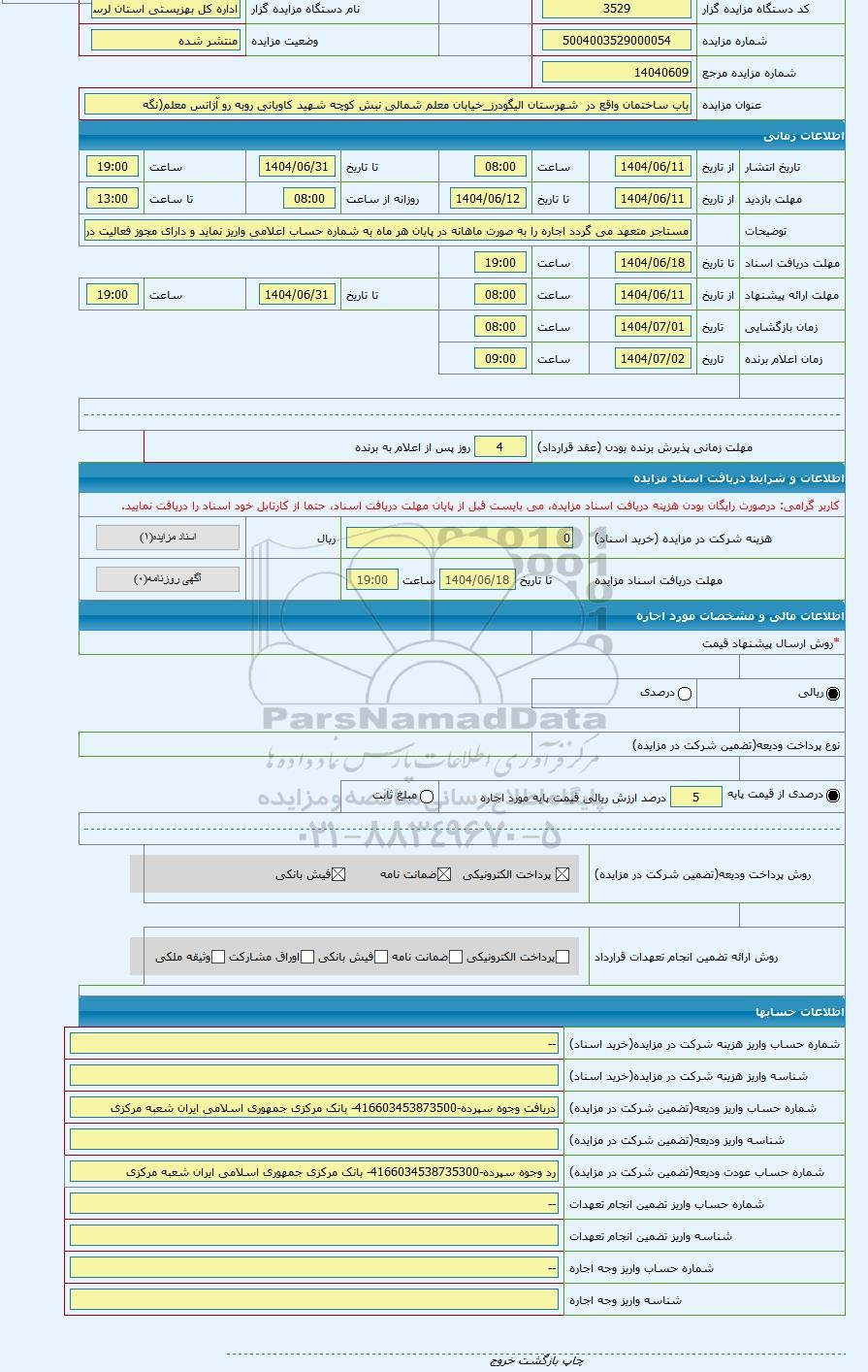 کد مزایده گزار3529نام دستگاه مزایده گزاراداره کل بهزیستی استان لرستان
