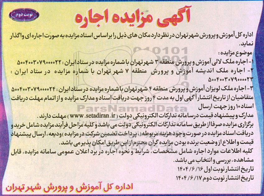 اداره کل آموزش و پرورش شهر تهران در نظر دارد مکانهای ذیل را بر اساس اسناد مزایده به صورت اجاره ای واگذار نماید.