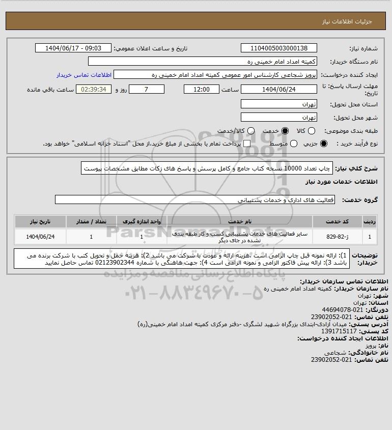 شرح کلی نیاز: چاپ تعداد 10000 نسخه کتاب جامع و کامل پرسش و پاسخ های زکات مطابق مشخصات پیوست