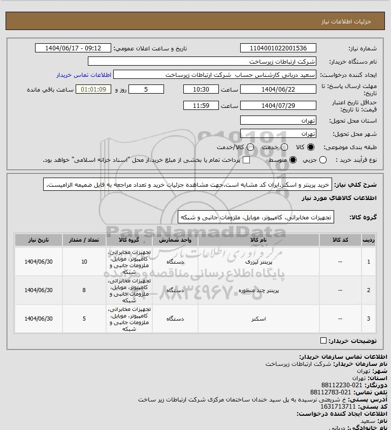 | 1 | -- | پرینتر لیزری | دستگاه | تجهیزات مخابراتی، کامپیوتر، موبایل، ملزومات جانبی و شبکه | 10 | 1404/06/30 |