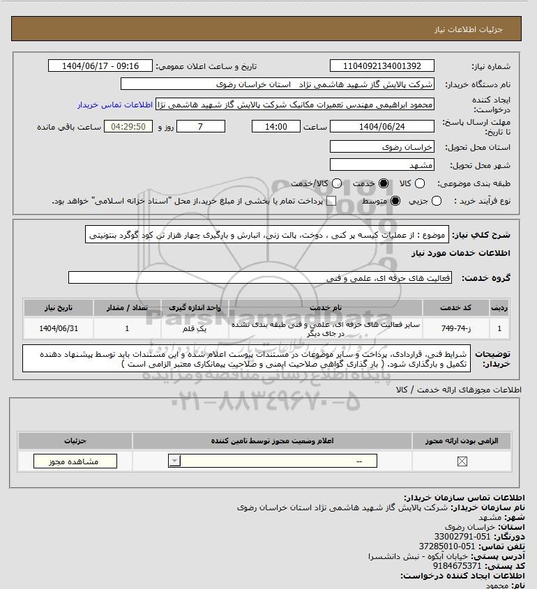 نام دستگاه خریدار:شرکت پالایش گاز شهید هاشمی نژاد استان خراسان رضوی