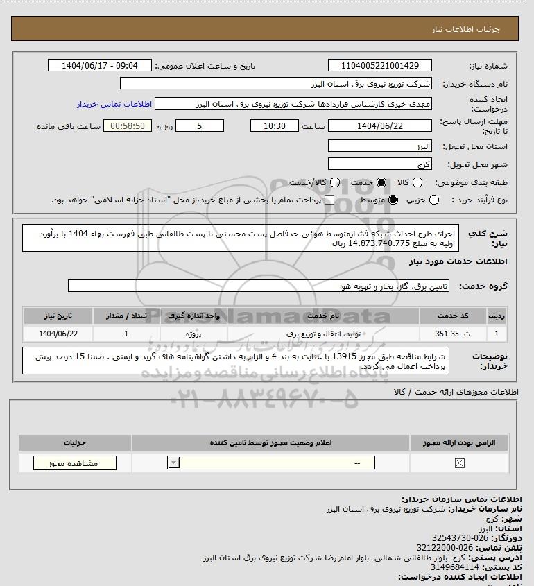 استعلام اجرای طرح احداث شبکه فشارمتوسط هوائی حدفاصل پست محسنی تا پست طالقانی طبق فهرست بهاء 1404 با برآورد اولیه به مبلغ 14.873.740.775 ریال, استعلام اجرای طرح احداث شبکه فشارمتوسط هوائی حدفاصل پست محسنی تا پست طالقانی طبق فهرست بهاء 1404 با برآورد اولیه به مبلغ 14.873.740.775 ریال