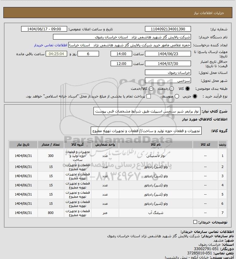 نام دستگاه خریدار:شرکت پالایش گاز شهید هاشمی نژاد استان خراسان رضوی