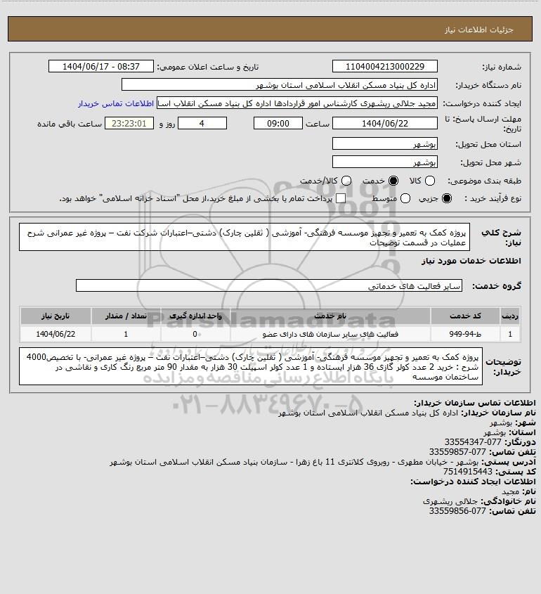 شرح کلی نیاز: پروژه کمک به تعمیر و تجهیز موسسه فرهنگی- آموزشی ( ثقلین چارک) دشتی–اعتبارات شرکت نفت – پروژه غیر عمرانی شرح عملیات در قسمت توضیحات