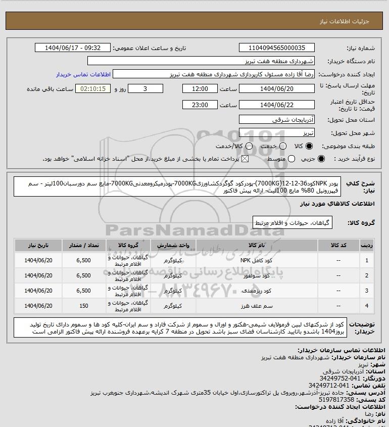 3 -- کود ریزمغذی کیلوگرم گیاهان، حیوانات و اقلام مرتبط 6,500 1404/06/20