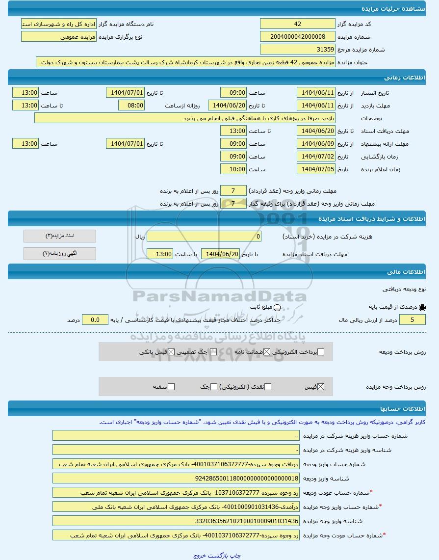 | عنوان مزایده | مزایده عمومی 42 قطعه زمین تجاری واقع در شهرستان کرمانشاه شرک رسالت پشت بیمارستان بیستون و شهرک دولت -مزایده زمین - استان کرمانشاه | |||