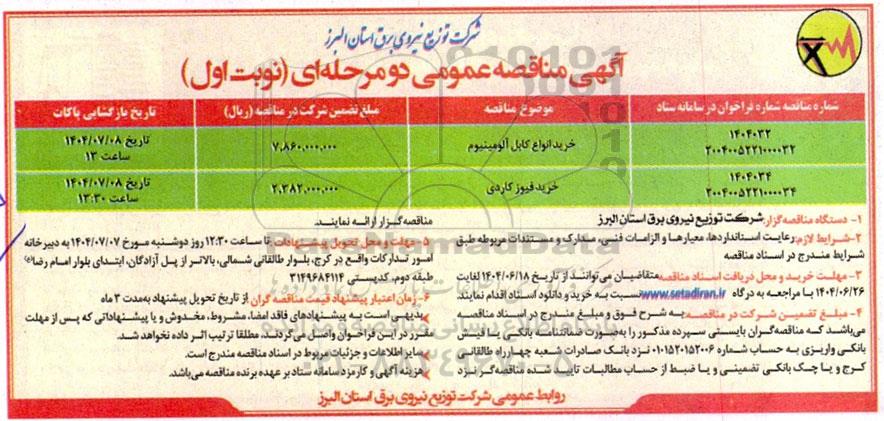 مناقصه خرید انواع کابل آلومینیوم..., مناقصه خرید انواع کابل آلومینیوم...