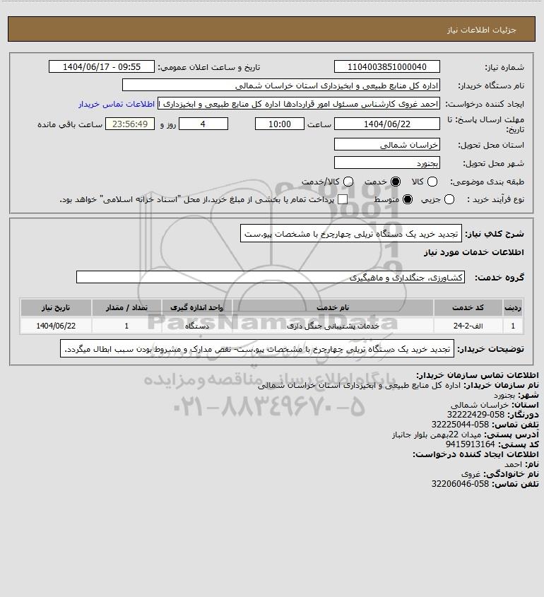 نام دستگاه خریدار:اداره کل منابع طبیعی و ابخیزداری استان خراسان شمالی