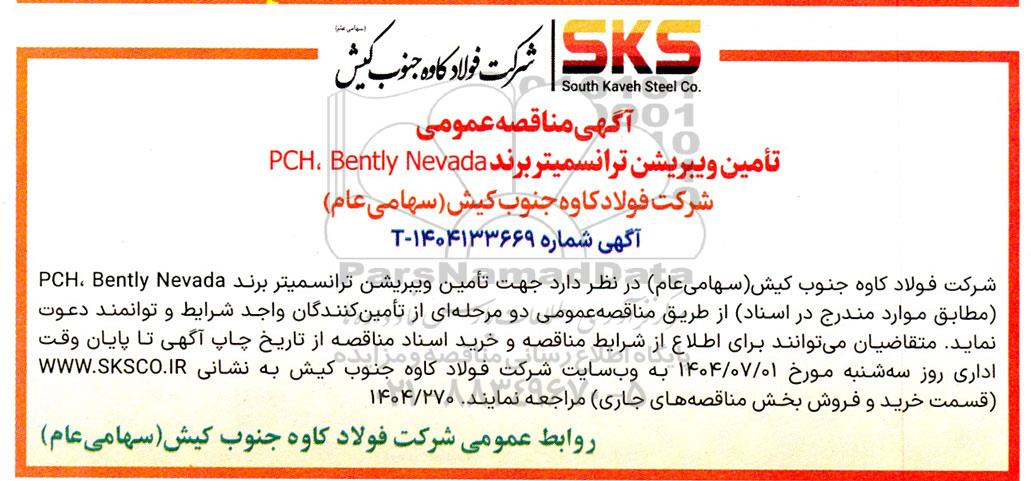 شرکت فولاد کاوه جنوب کیش (سهامی عام) در نظر دارد در نظر دارد جهت تأمین ویبریشن ترانسمیتر برند PCH ، Bently Nevada (مطابق موارد مندرج در اسناد) از طریق مناقصه عمومی دو مرحله ای از تأمین کنندگان واجد شرایط و توانمند دعوت نماید. متقاضیان میتوانند برای اطلاع از شرایط مناقصه و خرید اسناد مناقصه از تاریخ چاپ آگهی تا پایان وقت اداری روز سه شنبه مورخ 1404.07.01 به وب سایت شرکت فولاد کاوه جنوب کیش به نشانی WWW.SKSCO.IR قسمت خرید و فروش بخش مناقصه های جاری مراجعه نمایند. 1404/270