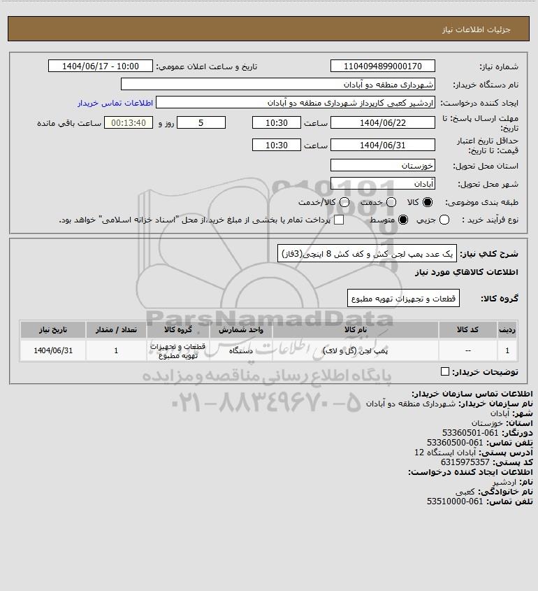 شرح کلی نیاز: یک عدد پمپ لجن کش و کف کش 8 اینچی(3فاز)