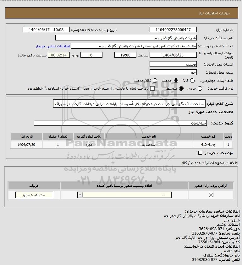 شرح کلی نیاز: ساخت اتاق نگهبانی حراست در محوطه پلاژ تأسیسات پایانه صادراتی میعانات گازی بندر سیراف