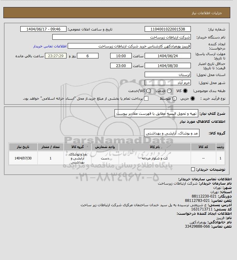 شرح کلی نیاز: تهیه و تحویل البسه مطابق با فهرست مقادیر پیوست