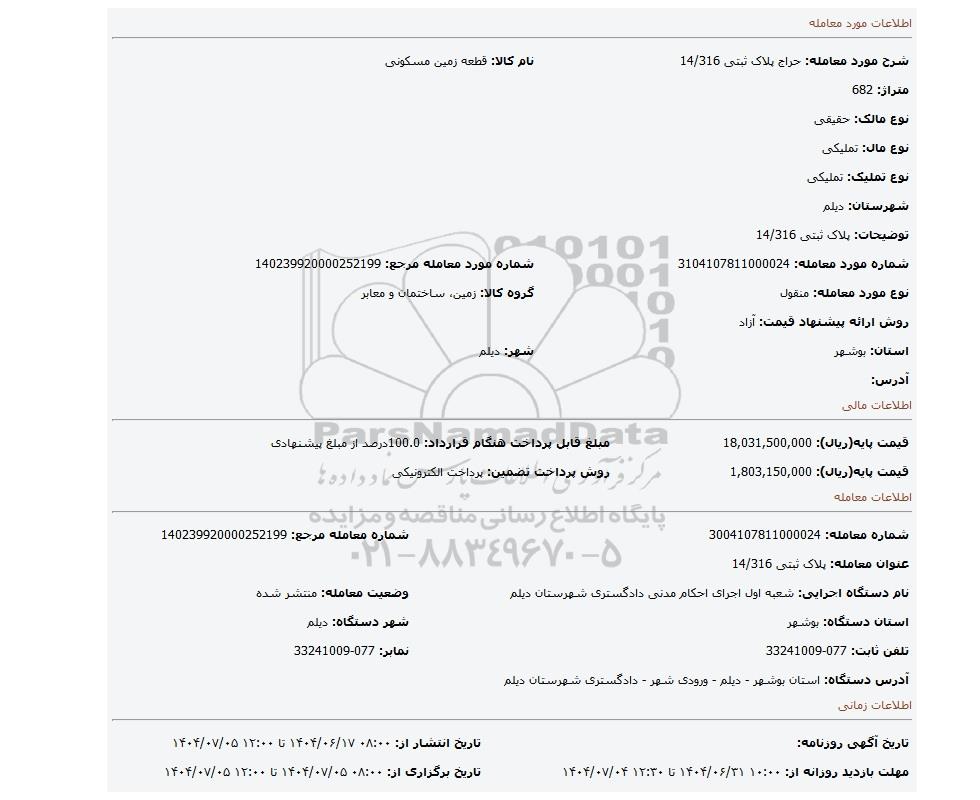 قیمت پایه(ریال): 1,803,150,000روش پرداخت تضمین: پرداخت الکترونیکی