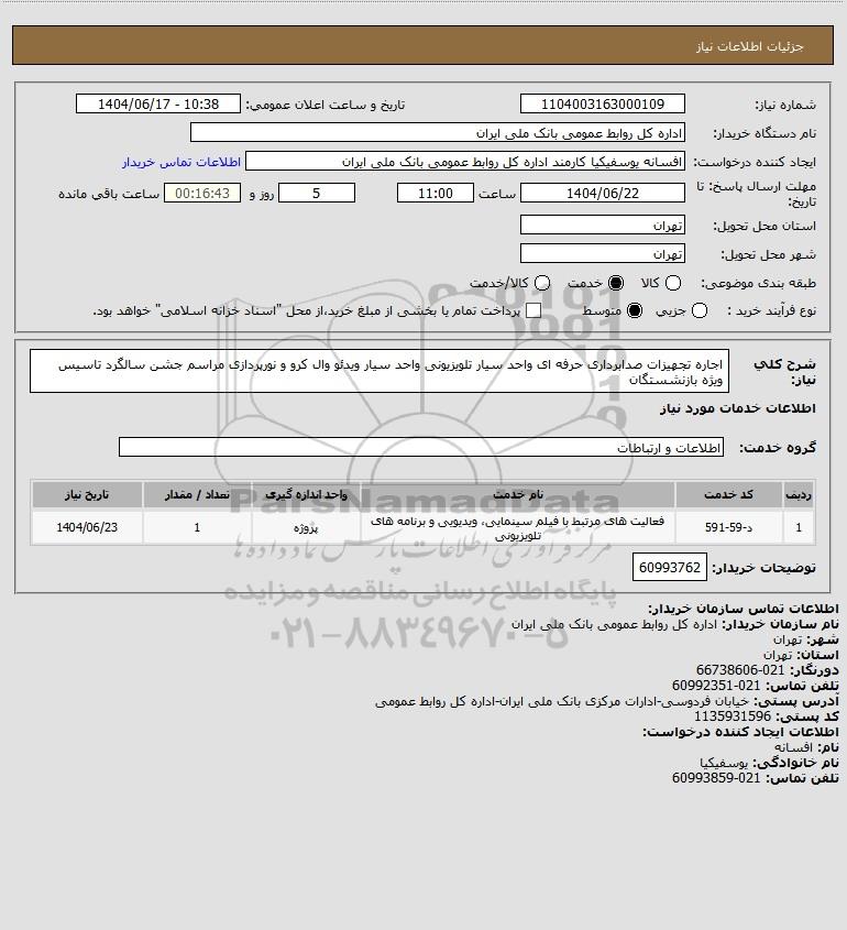نام دستگاه خریدار:اداره کل روابط عمومی بانک ملی ایران