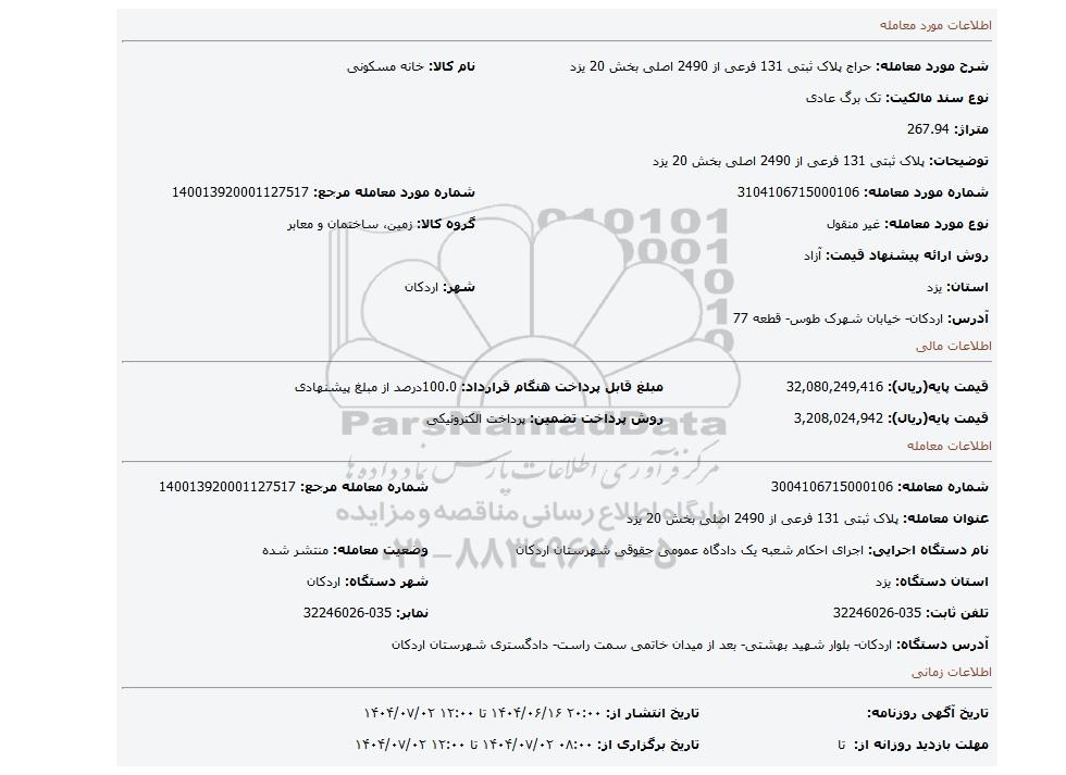 | عنوان معامله: پلاک ثبتی 131 فرعی از 2490 اصلی بخش 20 یزد | ||