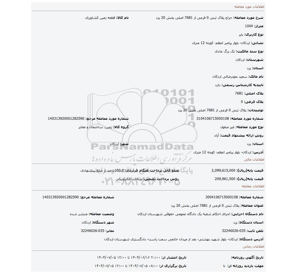 | شرح مورد معامله: حراج پلاک ثبتی 0 فرعی از 7681 اصلی بخش 20 یزد | نام کالا: قطعه زمین کشاورزی | |