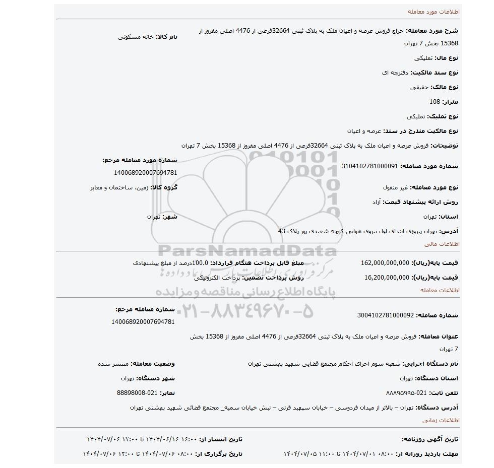عنوان معامله: فروش عرصه و اعیان ملک به پلاک ثبتی 32664فرعی از 4476 اصلی مفروز از 15368 بخش 7 تهران