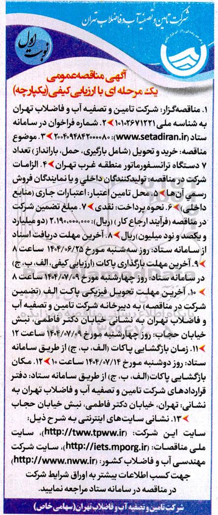 3- موضوع مناقصه: خرید و تحویل (شامل بارگیری، حمل، بارانداز) تعداد 7 دستگاه ترانسفورماتور منطقه غرب تهران
