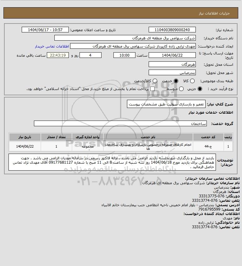 شرح کلی نیاز: تعمیر و بازسازی سوئیت طبق مشخصات پیوست
