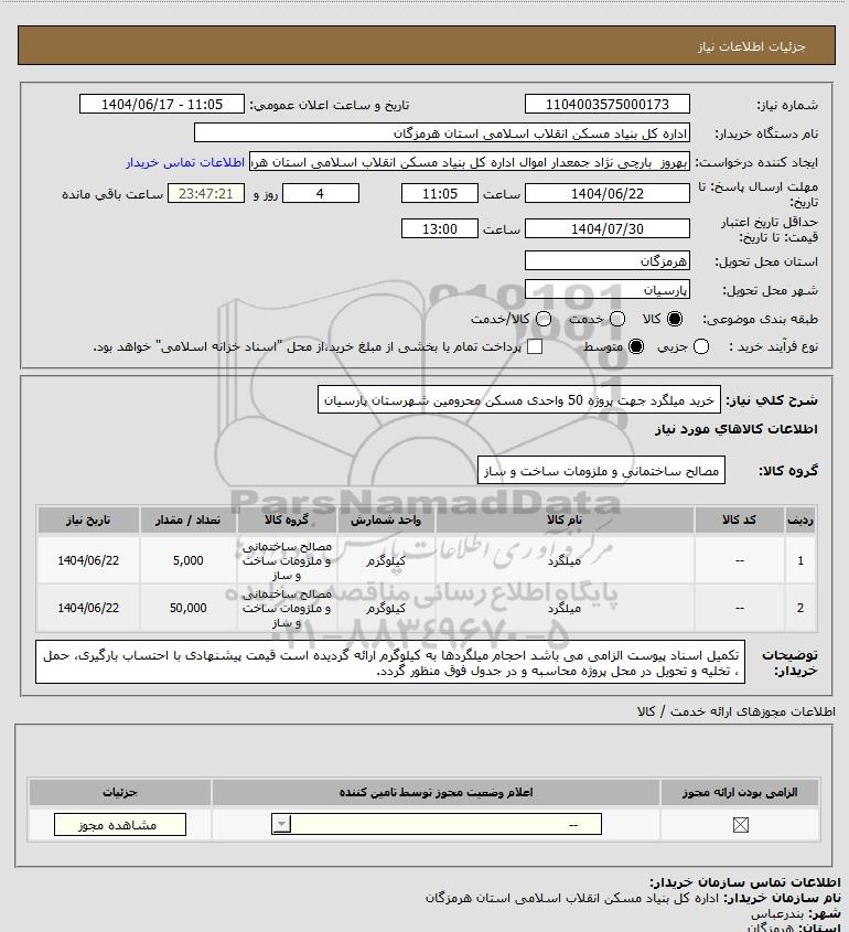 شرح کلی نیاز: خرید میلگرد جهت پروژه 50 واحدی مسکن محرومین شهرستان پارسیان