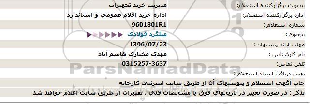 استعلام بها و موضوع استعلام استعلام, استعلام میلگرد فولادی به اطلاع کلیه شرکتها و افراد متخصص واجد شرایط میرساند، آگهی گذار در نظر دارد از طریق استعلام بها، نسبت به انتخاب و دریافت پیشنهادات اقدام نماید. این استعلام با کد آگهی ثبت شده در سامانه خبرگزاری پارس نماد : 951901 منتشر شده است. مشخصات استعلام : تاریخ شروع استعلام: 1396/07/19 آخرین مهلت ارسال پیشنهاد قیمت : 1396/07/23 و محل اجرای پروژه : استان اصفهان میباشد. استعلام قیمت مورد درخواست : استعلام, استعلام میلگرد فولادی با دستهبندیهای تخصصی و گروه های مرتبط : آهن آلات, استعلام اطلاع رسانی میگردد.