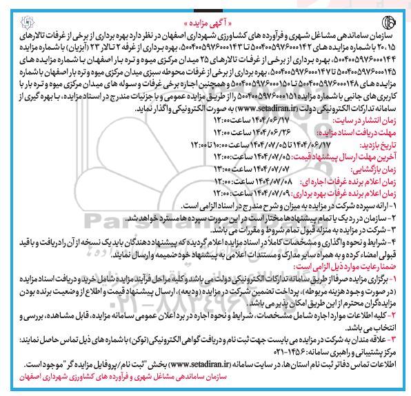 سازمان ساماندهی مشاغل شهری و فرآورده های کشاورزی شهرداری اصفهان در نظر دارد بهره برداری از برخی غرفات تالارهای 15،20 با شماره مزایده های 5004005976000142 تا 5004005976000143 بهره برداری از غرفه 2 تالار 23 آبزیان با شماره مزایده 5004005976000144، بهره برداری از برخی غرفات تالارهای 25 میدان مرکمزی میوه و تره بار اصفهان با شماره مزایده های 5004005976000145 تا 5004005976000147 ، بهره برداری از بخی غرفات محوطه سبزی میدان مرکزی میوه و تره بار اصفهان بهشماره مزایده 5004005976000148 تا 5004005976000150 و همچنین اجاره برخی غرفات و سوله های میداان مرکزی میوه و تره بار با کاربری های جانبی باشماره مزایده 5004005976000151 را از طریق مزایده عمومی و با جزئیات مندرج در اسناد مزایده با بهره گیری از سامانه تدارکات الکترونیکی دولت ستاد ایران به صورت الکترونیکی واگذار نماید.