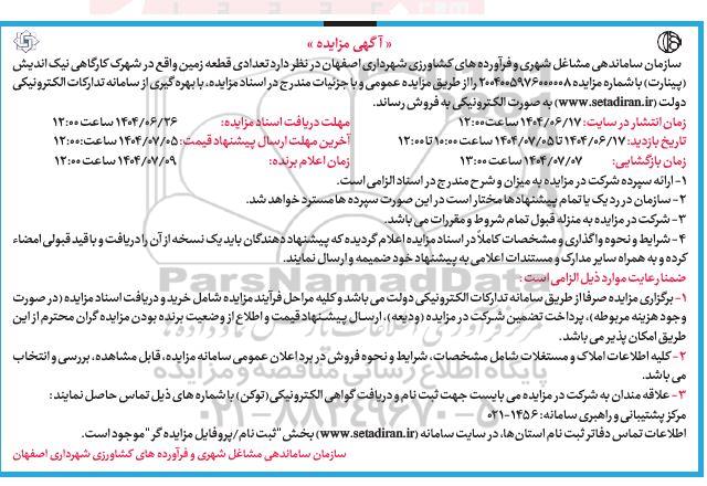 مزایده عمومی ز برگزار میگردد. از کلیه افراد متخصص و شرکت‌های واجد شرایط دعوت به عمل می‌آید تا در این مزایده با کد خبرگزاری پارس نماد : 9519070 شرکت نمایند تاریخ شروع مزایده : 1404/06/17 مهلت شرکت در مزایده: تا پایان روز 1404/06/26 مکان برگزاری اموال واگذاری استان‌های اصفهان و دسته‌بندی‌های مربوط به این حراجی املاک و زمین میباشد. اطلاعات دقیق‌تر درباره شرایط شرکت در مزایده آنلاین و نحوه ارسال مدارک، الزامات پروژه و دریافت اسناد مزایده و تاریخ بازگشایی پاکت‌ها، در بخش اطلاعات تکمیلی این آگهی درج شده است.