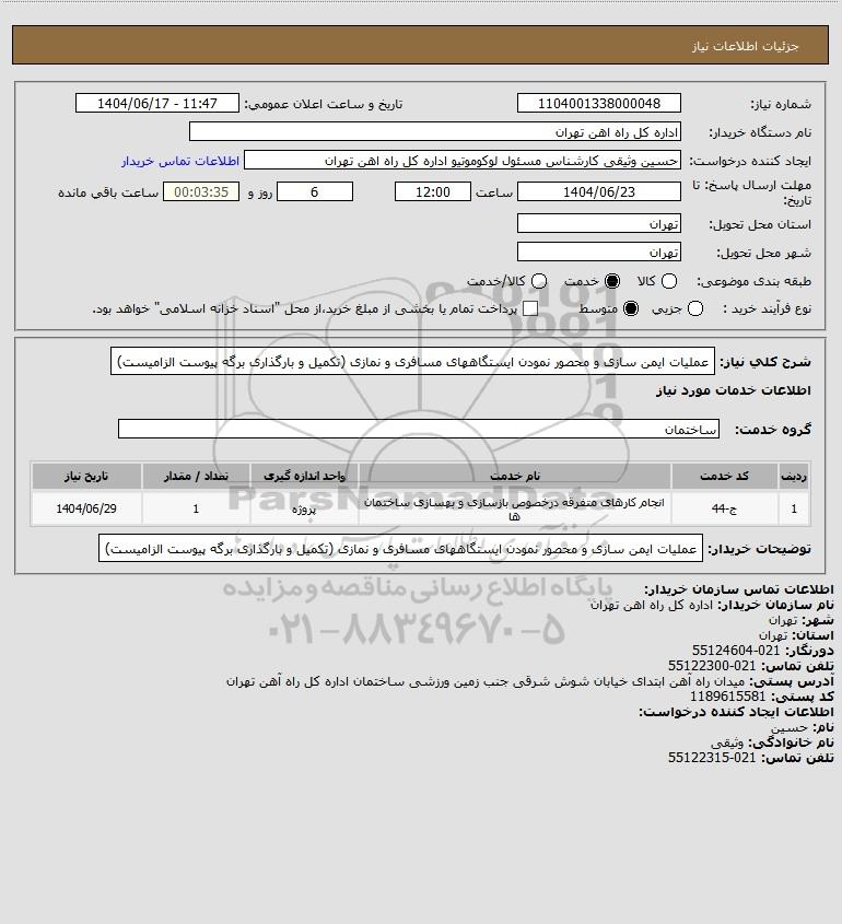 شرح کلی نیاز: عملیات ایمن سازی و محصور نمودن ایستگاههای مسافری و نمازی (تکمیل و بارگذاری برگه پیوست الزامیست)