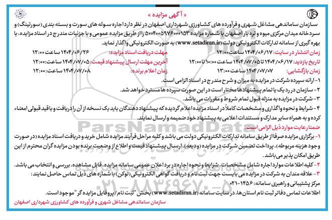 سازمان ساماندهی مشاغل شهری و فرآورده های کشاورزی شهرداری اصفهان در نظر دارد اجاره سوله های سورت و بسته بندی (سورتینگ) و سردخانه میدان مرکزی میوه و تره بار اصفهان به شماره مزایده 5004005976000153 را از طریق مزایده عمومی و با جزئیات مندرج در اسناد مزایده با بهره گیری از سامانه تدارکات الکترونیکی دولت ستاد ایران به صورت الکترونیکی واگذار نماید.