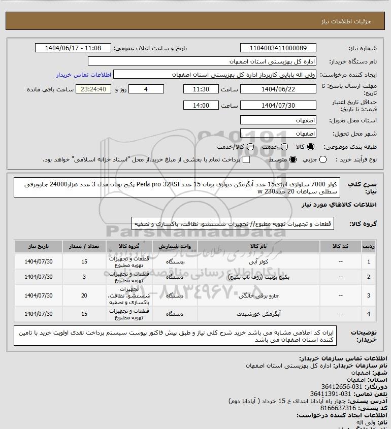 | 1 | -- | کولر آبی | دستگاه | قطعات و تجهیزات تهویه مطبوع | 15 | 1404/07/30 |