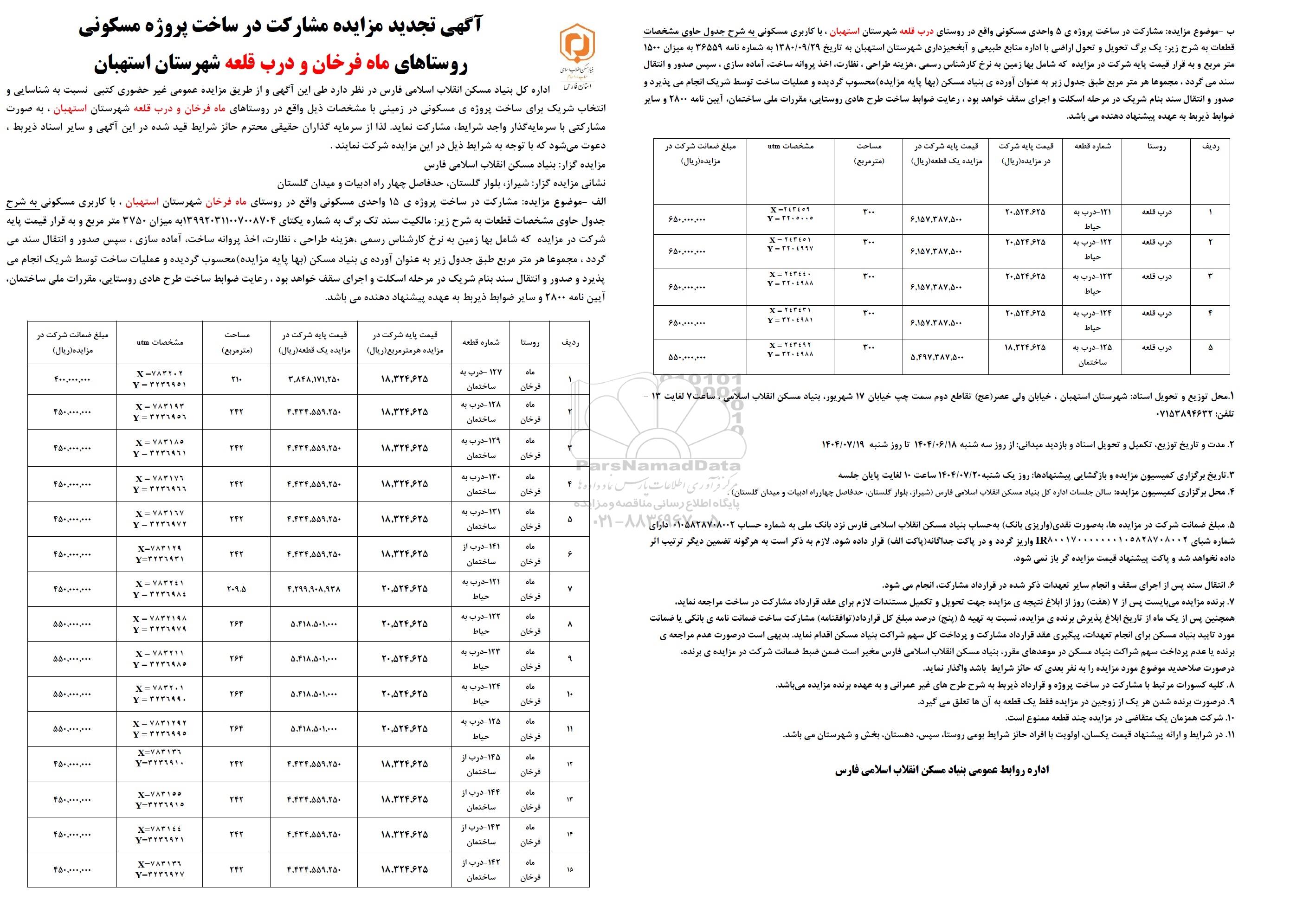 اداره کل بنیاد مسکن انقلاب اسلامی فارس در نظر دارد طی این آگهی و از طریق مزایده عمومی غیر حضوری کتبی نسبت به شناسایی و خاب شریک برای ساخت پروژه ی مسکونی در زمینی با مشخصات ذیل واقع در روستاهای ماه فرخان و درب قلعه شهرستان استهبان ، به صورت شارکتی با سرمایه گذار واحد شرایط مشارکت نماید. لذا از سرمایه گذاران حقیقی محترم حائز شرایط قید شده در این آگهی و سایر استاد ذیربط .