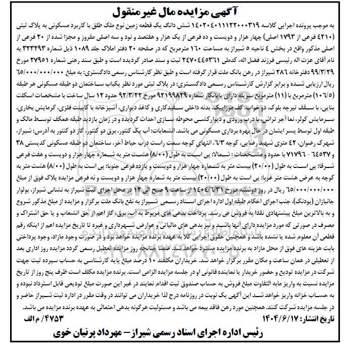 مزایده ششدانگ یک قطعه زمین با کاربری مسکونی به پلاک ثبتی 4210 فرعی از 1793 اصلی