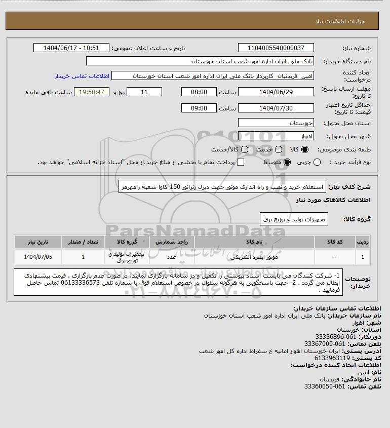 استعلام استعلام خرید و نصب و راه اندازی موتور جهت دیزل ژنراتور 150 کاوا شعبه رامهرمز, استعلام استعلام خرید و نصب و راه اندازی موتور جهت دیزل ژنراتور 150 کاوا شعبه رامهرمز