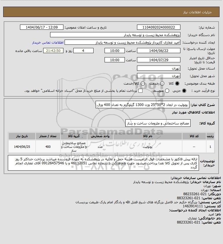 شرح کلی نیاز: یونولیت در ابعاد 2*50*25 وزن 1300 گیلوگرم به تعداد 400 ورق