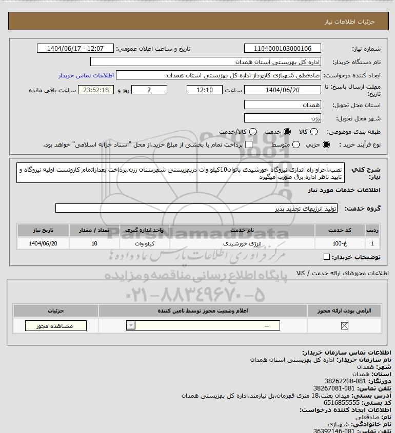 استعلام نصباجراو راه اندازی نیروگاه خورشیدی باتوان10کیلو وات دربهزیستی شهرستان رزن.پرداخت بعدازاتمام کاروتست اولیه نیروگاه و تایید ناظر اداره برق صورت میگیرد, استعلام نصب،اجراو راه اندازی نیروگاه خورشیدی باتوان10کیلو وات دربهزیستی شهرستان رزن.پرداخت بعدازاتمام کاروتست اولیه نیروگاه و تایید ناظر اداره برق صورت میگیرد