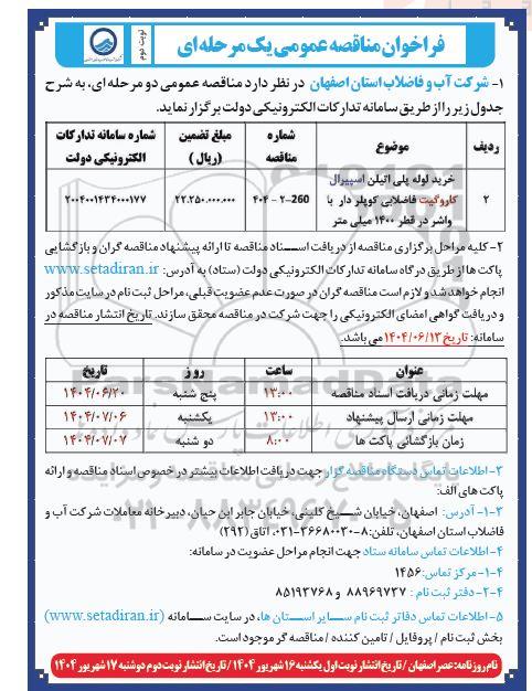 شرکت آب و فاضلاب استان اصفهان در نظر دارد مناقصه عمومی دو مرحله ای به شرح جدول زیر را از طریق سامانه تدارکات الکترونیکی دولت برگزار نماید.