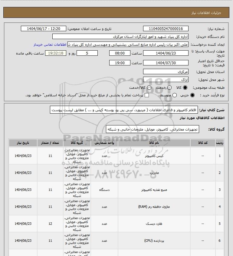 شرح کلی نیاز: اقلام کامپیوتر و فناوری اطلاعات ( مینبورد، سی پی یو، پوسته کیس و ... ) مطابق لیست پیوست