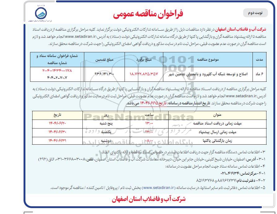| 6 ماه | اصلاح و توسعه شبکه آب کلهرود و باغمیران شاهین شهر | 18.722.825.357 | 936.141.300 | 2004001434000178 7،70-2-404 |