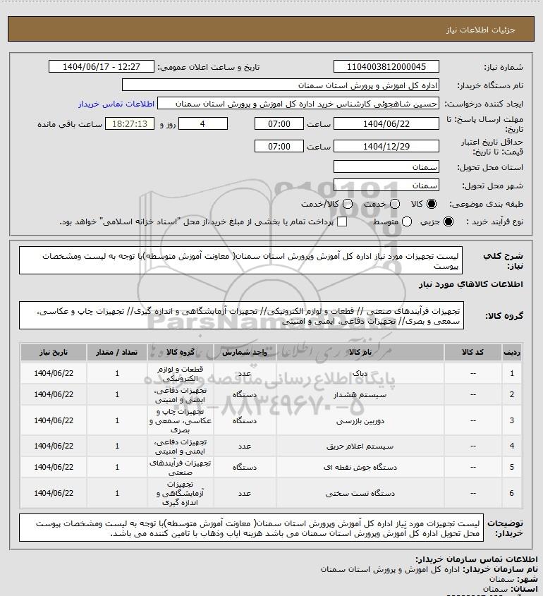 استعلام بها و موضوع استعلام استعلام لیست تجهیزات مورد نیاز اداره کل آموزش وپرورش استان سمنان( معاونت آموزش متوسطه)با توجه به لیست ومشخصات پیوست به اطلاع کلیه شرکتها و افراد متخصص واجد شرایط میرساند، آگهی گذار در نظر دارد از طریق استعلام بها، نسبت به انتخاب و دریافت پیشنهادات اقدام نماید. این استعلام با کد آگهی ثبت شده در سامانه خبرگزاری پارس نماد : 9519624 منتشر شده است. مشخصات استعلام : تاریخ شروع استعلام: 1404/06/17 آخرین مهلت ارسال پیشنهاد قیمت : 1404/06/22 و محل اجرای پروژه : استان مناقصات استان سمنان میباشد. استعلام قیمت مورد درخواست : استعلام لیست تجهیزات مورد نیاز اداره کل آموزش وپرورش استان سمنان( معاونت آموزش متوسطه)با توجه به لیست ومشخصات پیوست با دستهبندیهای تخصصی و گروه های مرتبط : ابزار دقیق, اقلام کمک آموزشی, خدمات و تجهیزات آزمایشگاهی و پزشکی, سیستم های حفاظتی-دوربین مدار بسته،دزدگیر،آیفون تصویری و آنتن مرکزی, دستگاه جوش و برش, سیستم ایمنی ، اتش نشانی،اعلام و اطفای حریق, تجهیزات تعمیرگاهی و کارگاهی, تجهیزات و ماشین آلات صنعتی, خدمات خودرویی-بیمه شخص ثالث،تعمیرات و معاینه فنی, استعلام اطلاع رسانی میگردد.
