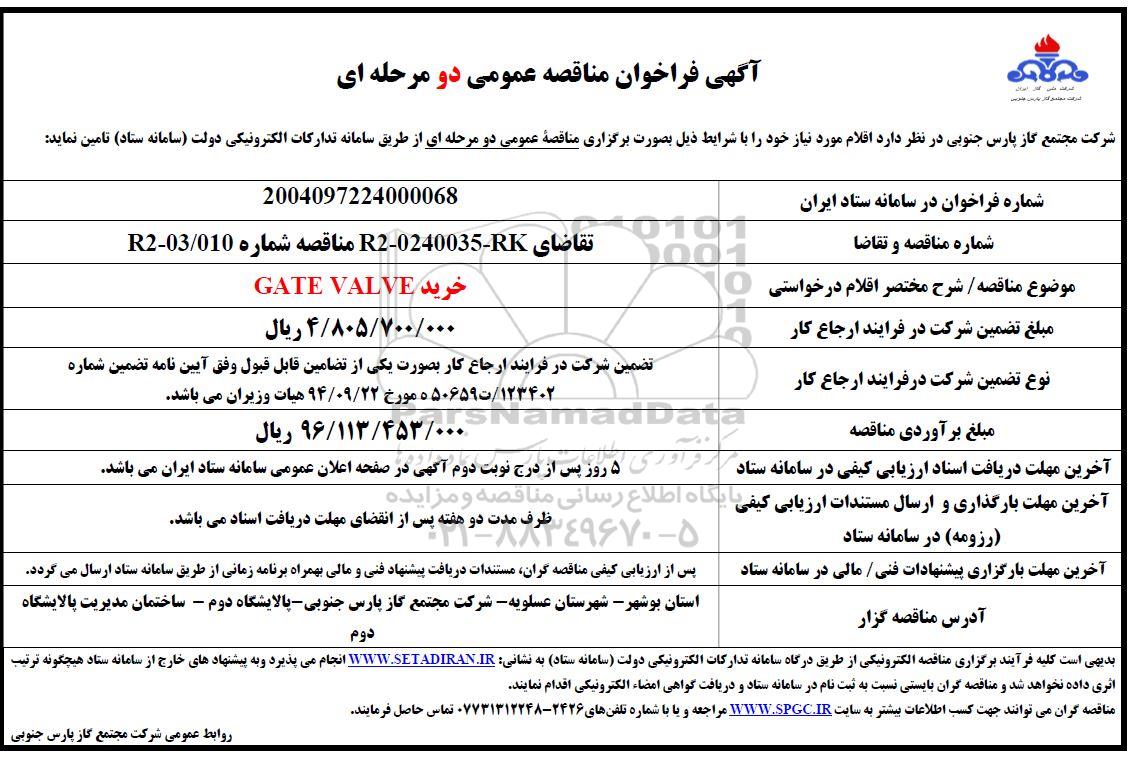 مناقصه خرید GATE VALVE , مناقصه خرید GATE VALVE